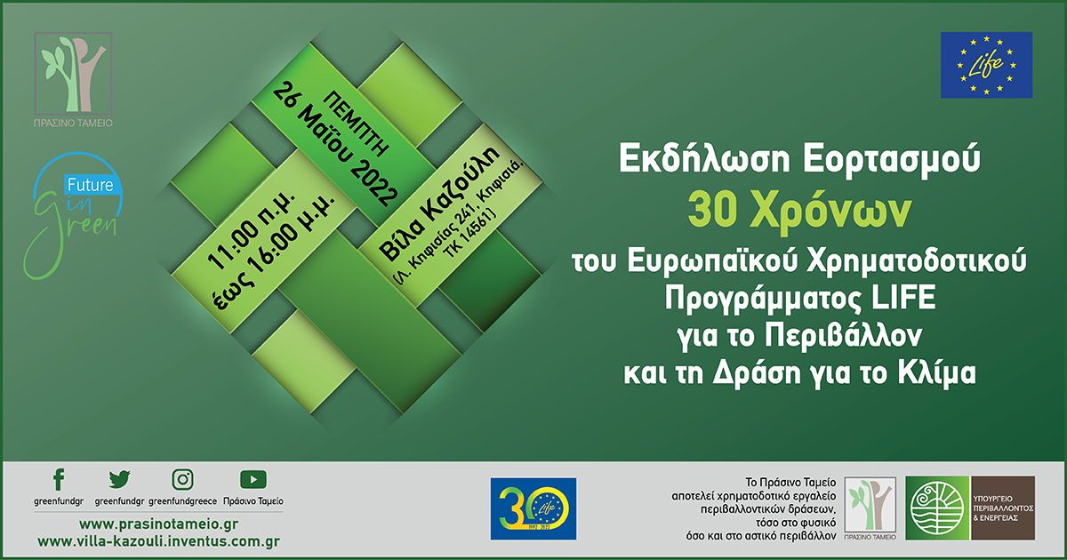Το Πράσινο Ταμείο, εποπτευόμενος φορέας του Υπουργείου Περιβάλλοντος και Ενέργειας (ΥΠΕΝ) και έδρα του Eθνικού Σημείου Επαφής για το Ευρωπαϊκό Χρηματοδοτικό Πρόγραμμα LIFE/Περιβάλλον, διοργανώνει και σας προσκαλεί στην «Εκδήλωση Εορτασμού 30 Χρόνων του Ευρωπαϊκού Χρηματοδοτικού Προγράμματος LIFE για το Περιβάλλον και τη Δράση για το Κλίμα», την Πέμπτη 26 Μαΐου 2022 και ώρα 11:00-16:00, στην αίθουσα εκδηλώσεων της Βίλα Καζούλη (Λεωφόρος Κηφισίας 241, Κηφισιά, ΤΚ 14561).